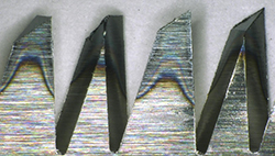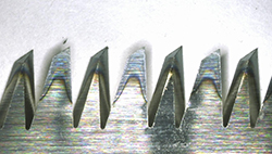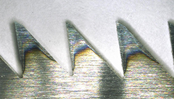 The teeth of Z-Saw blades are ground using our self-developed automatic tooth grinding system using CBN grinding wheels. Even the smallest distortion will be automatically detected and carefully corrected. Through this process, the blades can be ground to perfectly parallel edges , ensuring that the teeth bite into the workpiece completely straight. This is almost impossible to achieve with hand-filed teeth.
