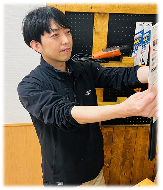 商品企画課で主に新商品の調査や提案、チラシとパッケージのデザインを担当しています。仕事の基本的な流れは、最初にリフォーム現場に伺ったり、営業部と連携して展示会に出展したり、SNS等で情報収集を行います。市場調査を基にした新商品企画が開発会議で可決された後、商品の試作を行います。その後、サンプルをユーザー様(職人、設備屋など)に意見を聞きながら改良を重ね、世に出せる形にしていきます。 また商品の発売に向けては、営業部とチラシとパッケージ製作の打合せ、製造部・技術部と生産スケジュールの打合せも行います。